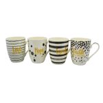 Κούπα από ποιοτική πορσελάνη Bone China, σε τέσσερα διαφορετικά σχέδια με πουα διακόσμηση και ρίγες και επιγραφή σε χρυσό χρώμα. Κατάλληλη για πλυντήριο πιάτων και φούρνο μικροκυμάτων. Η συσκευασία περιλαμβάνει και τα τέσσερα σχέδια.