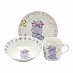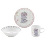 Σετ φαγητού 3 τεμαχίων από ποιοτική πορσελάνη με σχέδιο ιπποποταμάκι και σε συσκευασία δώρου. Το σετ περιλαμβάνει ένα πιάτο 17,5εκ.,ένα μπολ 15x6εκ. & μία κούπα χωρητικότητας 230ml. Είναι κατάλληλο για πλυντήριο πιάτων και φούρνο μικροκυμάτων.