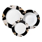 Σερβίτσιο φαγητού από ποιοτική πορσελάνη, στρογγυλό, με γεωμετρικό μοτίβο στο πλαίσιο. Το σετ περιλαμβάνει 6 πιάτα ρηχά 26εκ.,6 πιάτα βαθιά 21,5εκ. και 6 πιάτα φρούτου 19εκ.Κατάλληλο για χρήση στο πλυντήριο πιάτων και τον φούρνο μικροκυμάτων.