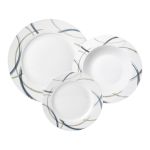 Σερβίτσιο φαγητού από ποιοτική πορσελάνη, στρογγυλό, με διακόσμηση στο πλαίσιο γκρι και μπεζ γραμμές.Το σετ περιλαμβάνει 6 πιάτα ρηχά 26εκ.,6 πιάτα βαθιά 21,5εκ. και 6 πιάτα φρούτου 19εκ.Κατάλληλο για χρήση στο πλυντήριο πιάτων κ τον φούρνο μικροκυμάτων.