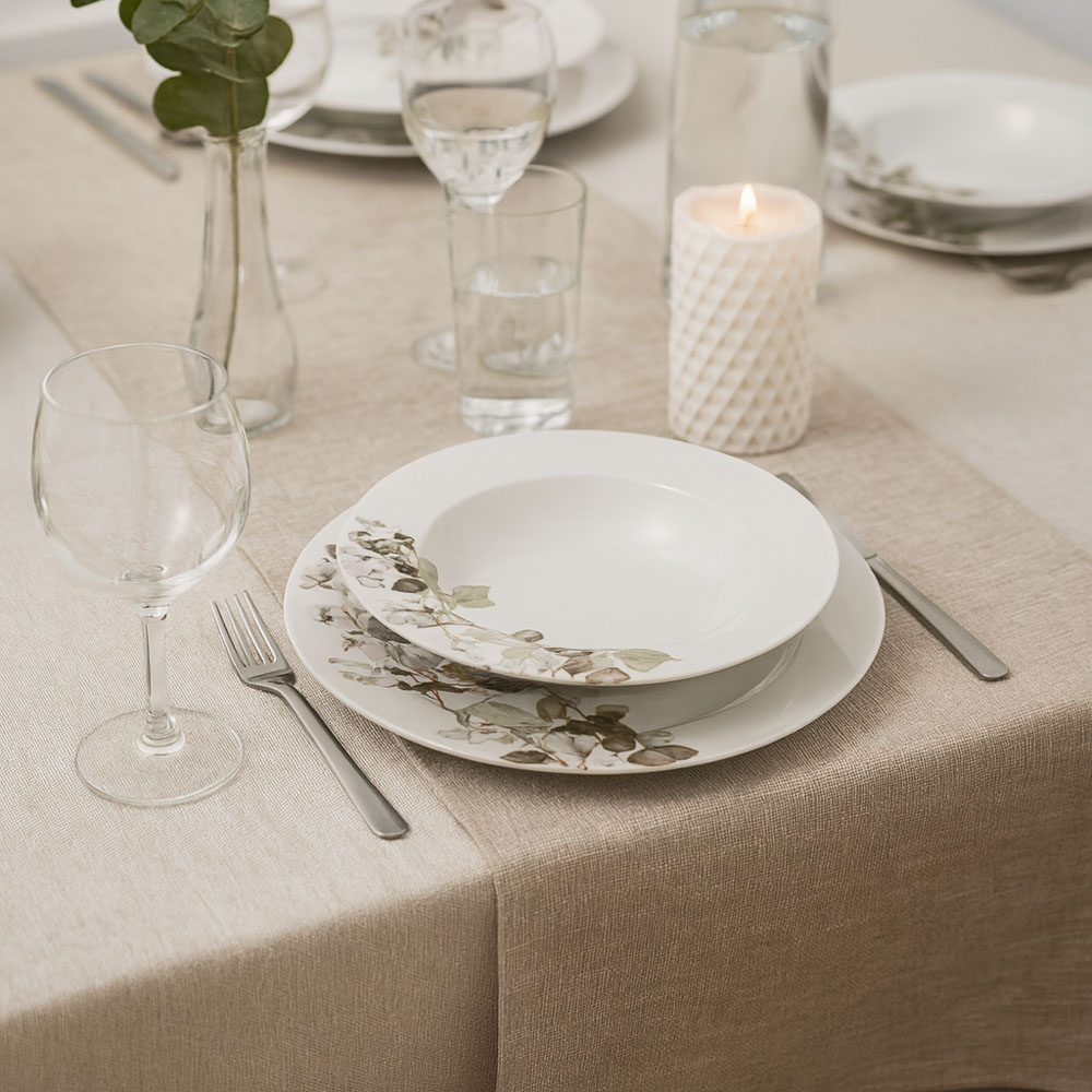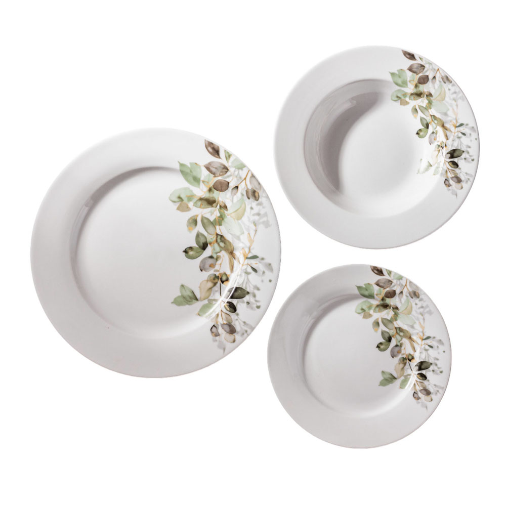 Σερβίτσιο φαγητού από ποιοτική πορσελάνη, στρογγυλό, με διακόσμηση στο πλαίσιο .Το σετ περιλαμβάνει 6 πιάτα ρηχά 26εκ.,6 πιάτα βαθιά 21,5εκ. και 6 πιάτα φρούτου 19εκ.Κατάλληλο για χρήση στο πλυντήριο πιάτων κ τον φούρνο μικροκυμάτων.