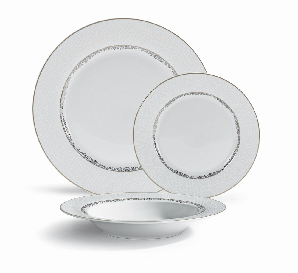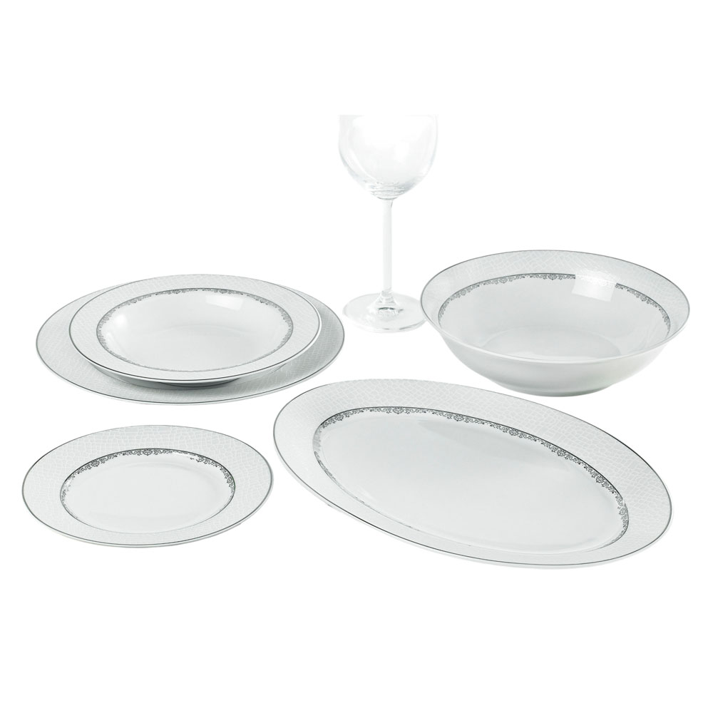 Σερβίτσιο φαγητού πορσελάνης, με ανάγλυφο κρακελέ σχέδιο και κομψή ασημί μπορντούρα που προσδίδει πολυτέλεια και φινέτσα στο τραπέζι. Το σετ περιλαμβάνει 6 πιάτα ρηχά 26,5εκ.,6 βαθιά 21,5εκ.,6 φρούτου 19εκ.,μια σαλατιέρα 23εκ.κ μια οβάλ πιατέλα 35,5εκ.