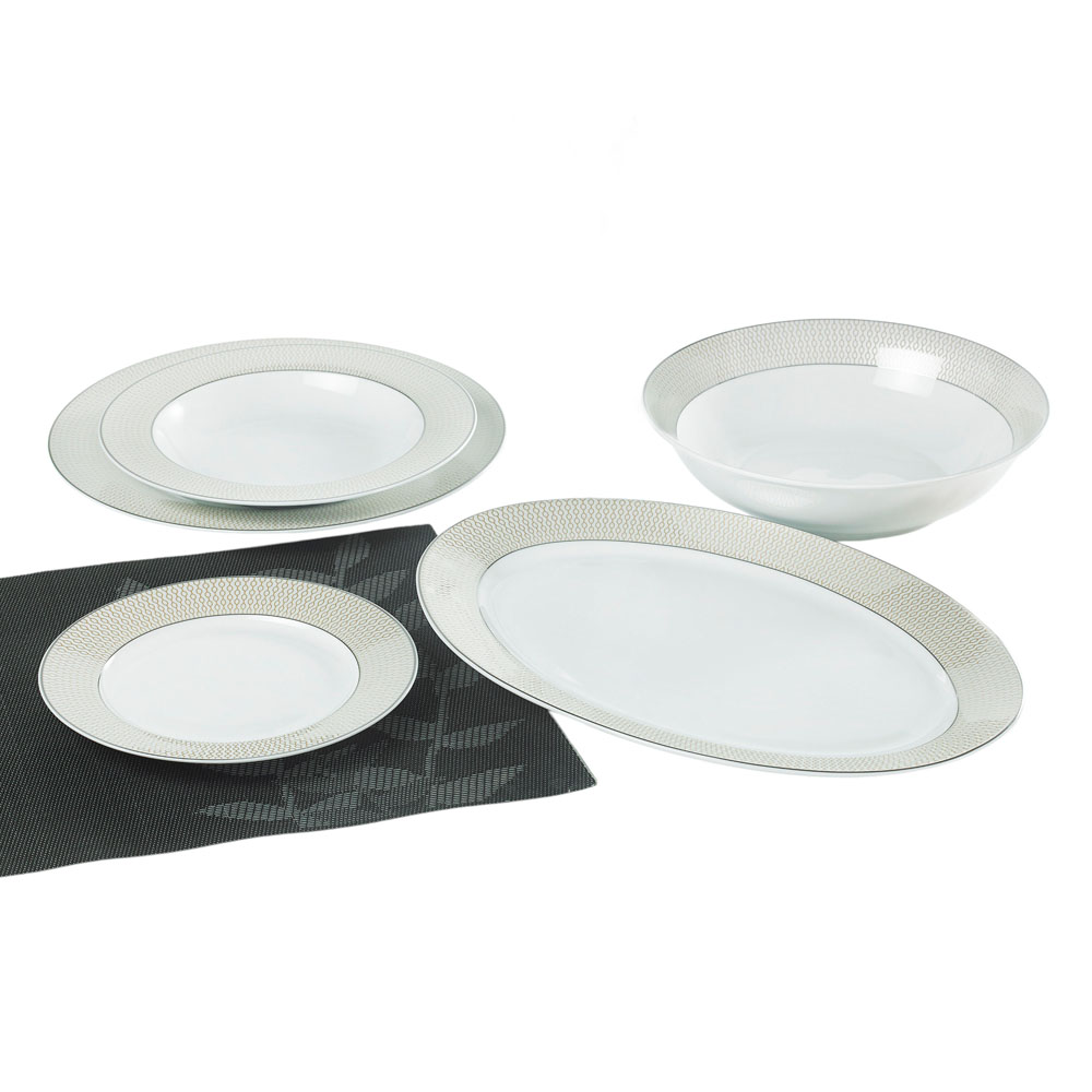 Σερβίτσιο φαγητού πορσελάνης, με διακριτικό χρυσό γεωμετρικό σχέδιο και ασημί μπορντούρα στο πλαίσιο που χαρίζει κομψότητα και πολυτέλεια.Το σετ περιλαμβάνει 6 πιάτα ρηχά 26,5εκ.,6 βαθιά 21,5εκ.,6 φρούτου 19εκ.,μια σαλατιέρα 23εκ.κ μια οβάλ πιατέλα 35,5εκ