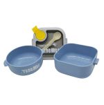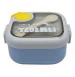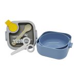 Φαγητοδοχείο διπλό πλαστικό,στρογγυλό το εσωτερικό δοχείο κ τετράγωνο το εξωτερικό σε σιέλ χρώμα. Διαθέτει πλαστικό καπάκι ασφαλείας,αεροστεγές κλείσιμο για να διατηρεί φρέσκο το φαγητό κ βαλβίδα αφαίρεσης αέρα.Στο καπάκι υπάρχει θήκη με κουτάλι κ ψαλίδι.