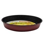 Στρογγυλό ταψί με αντικολλητική επίστρωση υψηλής ποιότητας σε μαύρο χρώμα με εφέ μάρμαρο και εξωτερικά σε κόκκινο χρώμα. Κατάλληλο για ψήσιμο στον αέρα αλλά και στις αντιστάσεις.
