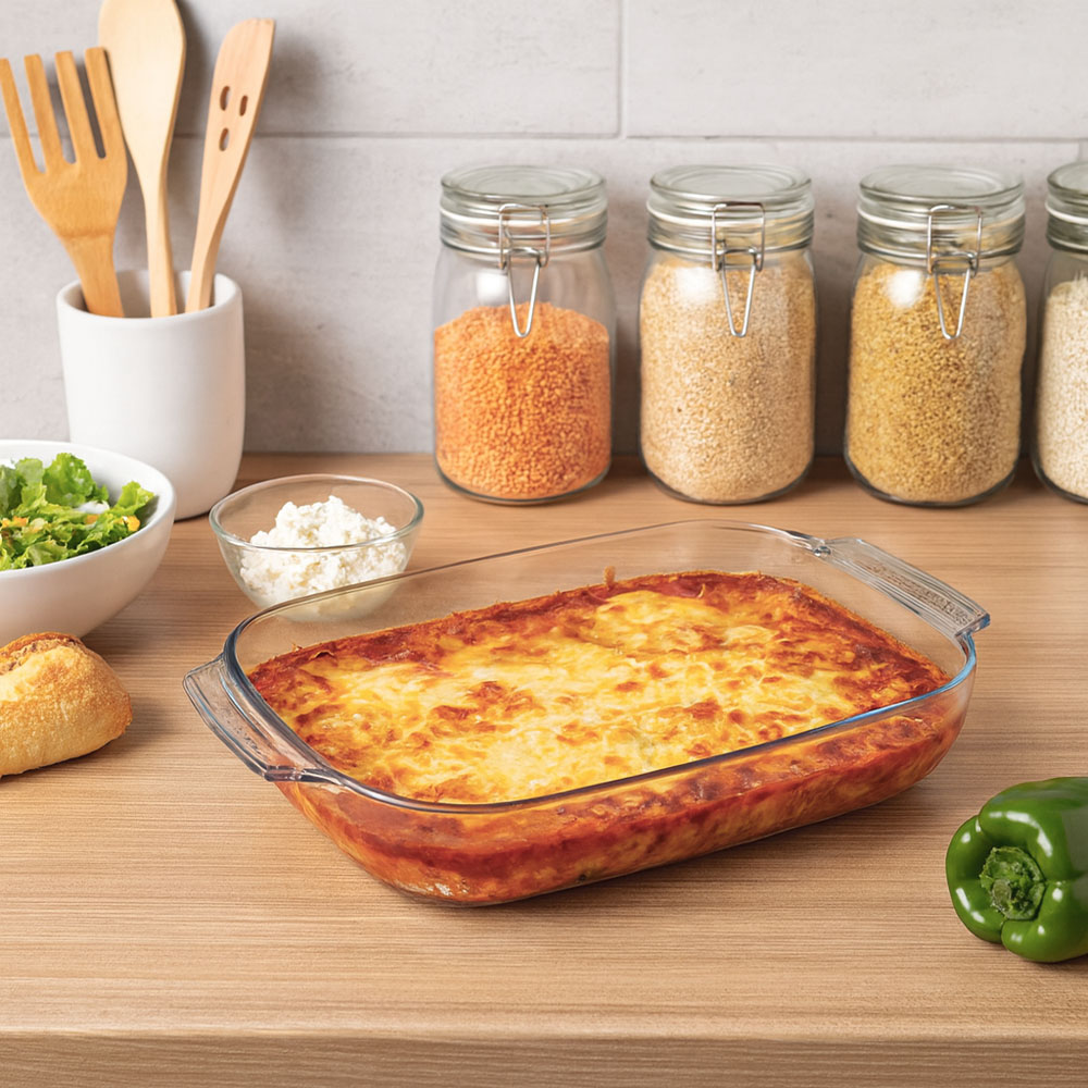 Πυρίμαχο σκεύος από γυαλί υψηλής ποιότητας για τέλεια αποτελέσματα στο μαγείρεμα και αντοχή στις υψηλές θερμοκρασίες. Κατάλληλο για πλυντήριο πιάτων, φούρνο, κατάψυξη και μικροκύματα, ανθεκτικό από -40 έως +400 βαθμούς Κελσίου (C).
