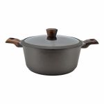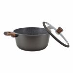 Κατσαρόλα κατασκευασμένη από χυτό αλουμίνιο συνδυάζει αντοχή με απόλυτη απόδοση για εκπληκτικά μαγειρικά αποτελέσματα. Η εσωτερική επιφάνεια διαθέτει τριπλή αντικολλητική επίστρωση πέτρας εξασφαλίζοντας αντοχή σε υψηλές θερμοκρασίες και γδαρσίματα. Διαθέτει γυάλινο πυράντοχο καπάκι το οποίο περιβάλλεται από στεφάνι σιλικόνης. Έχει ενισχυμένη εξωτερική επιφάνεια σε σκούρο καφέ χρώμα και βιομηχανικό πάτο για ομοιόμορφη κατανομή της θερμότητας. Οι λαβές της είναι από αντιολισθητικό βακελίτη soft touch σε όψη ξύλου προσφέροντας άνεση κατά τη χρήση και αντιθερμική προστασία. Επιπλέον, είναι κατάλληλη για όλες τις εστίες, συμπεριλαμβανομένων και των επαγωγικών. Τέλος, είναι ασφαλές για χρήση στο πλυντήριο πιάτων, καθιστώντας εύκολη την καθημερινή φροντίδα. Πάχος 1,6/4,0mm
