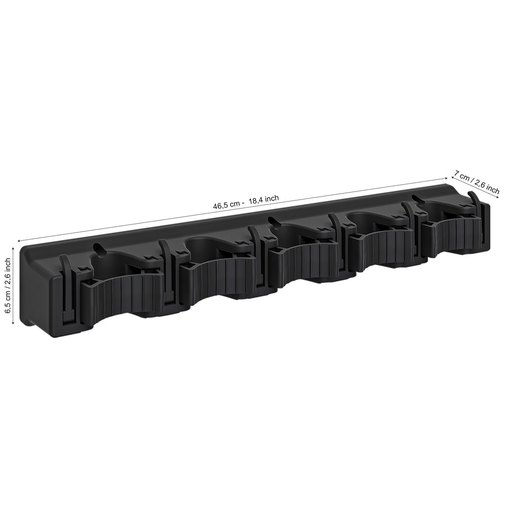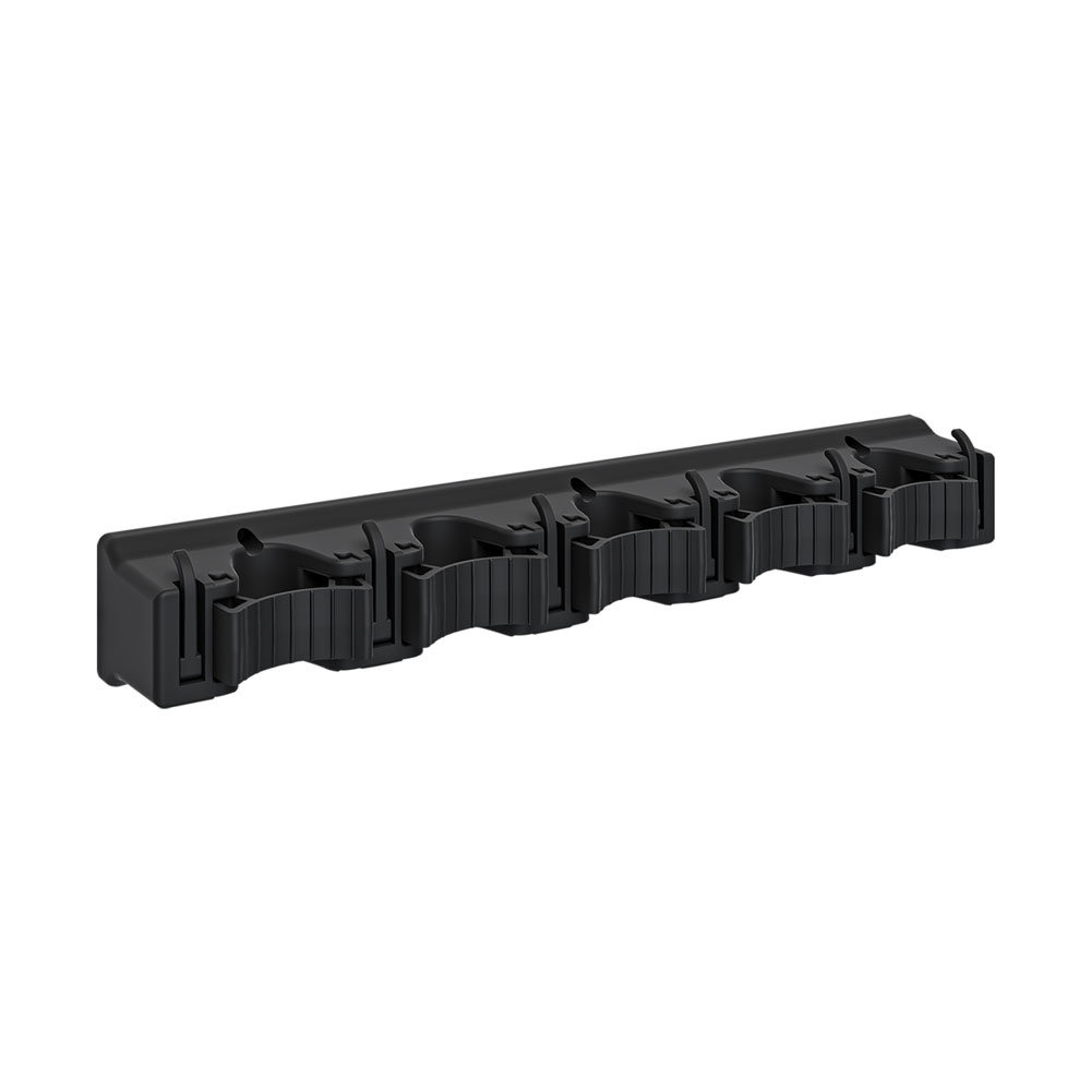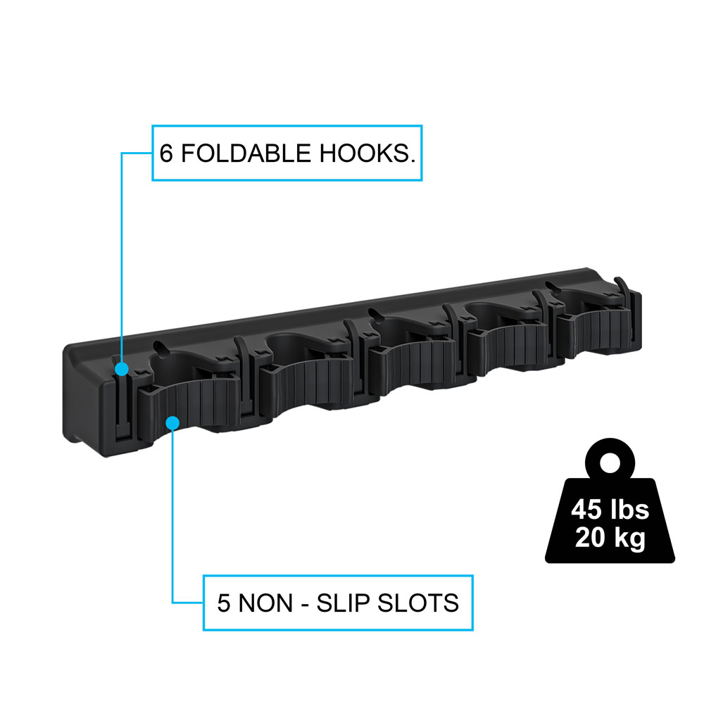 Πλαστική βάση τοίχου πολλαπλών χρήσεων, ιδανική για την οργάνωση του χώρου σας. Διαθέτει 5 θέσεις με αυτόματους σφιγκτήρες που συγκρατούν με ασφάλεια σκούπες, σφουγγαρίστρες ή εργαλεία με κοντάρι και 6 αναδιπλούμενους γάντζους για επιπλέον αντικείμενα.