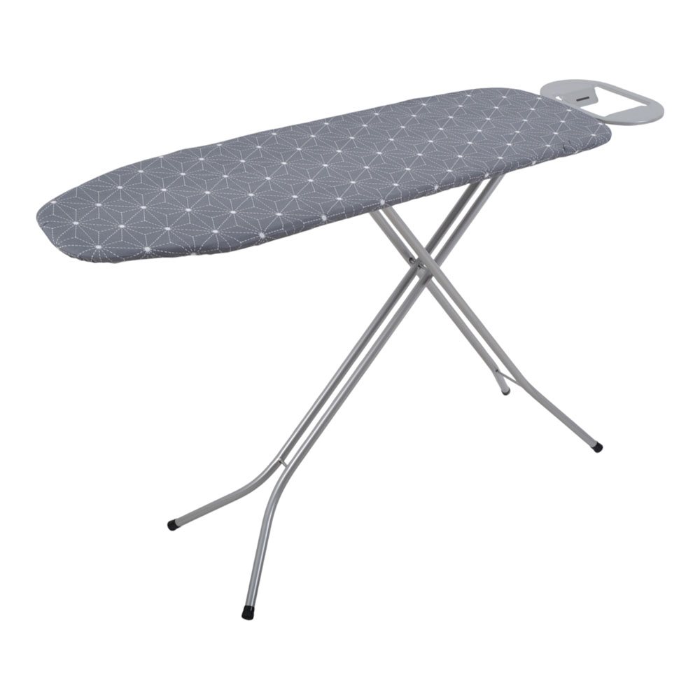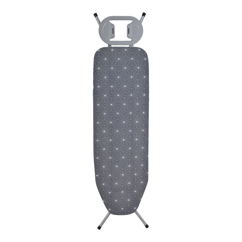 Σιδερώστρα με μεταλλικά γκρι πόδια,μεγάλη επιφάνεια σιδερώματος,ρύθμιση και ασφάλεια ύψους από 60 έως 92εκ.,θέση τοποθέτησης για το σίδερο και αντιολισθητικά ποδαράκια για μεγάλη ευστάθεια και σταθερότητα.Διαθέτει κάλυμμα 100% βαμβακερό.