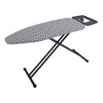 Σιδερώστρα με μεταλλικά μαύρα ματ πόδια, μεγάλη επιφάνεια σιδερώματος, ρύθμιση και ασφάλεια ύψους από 71 έως 94εκ.,θέση τοποθέτησης για το σίδερο και αντιολισθητικά ποδαράκια για μεγάλη ευστάθεια και σταθερότητα. Διαθέτει κάλυμμα 100% βαμβακερό.