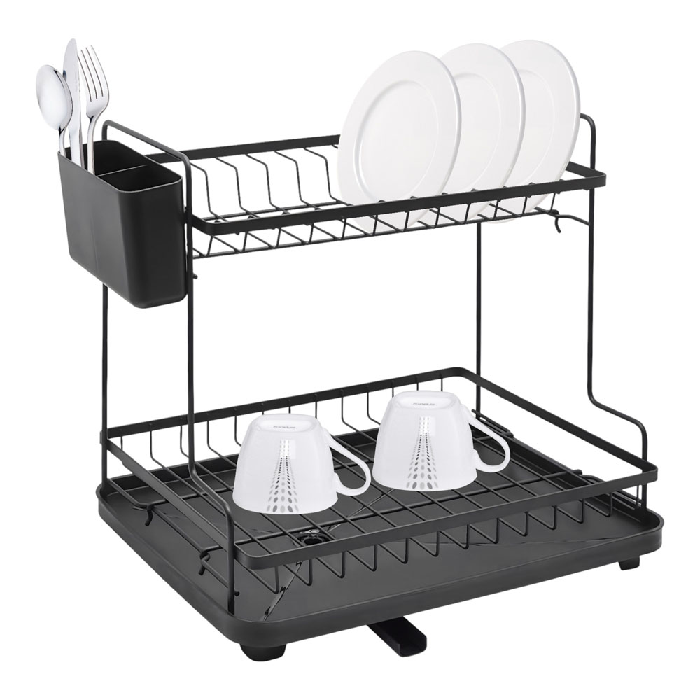 Πιατοθήκη διώροφη μεταλλική, η οποία διαθέτει πλαστικό δίσκο και κουταλοθήκη σε μαύρο ματ χρώμα. Το στόμιο αποστράγγισης εμποδίζει τη συγκέντρωση νερού μέσα στο δίσκο και κρατά τον πάγκο σας στεγνό και τακτοποιημένο. Πλένεται και καθαρίζεται εύκολα.