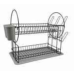 Πιατοθήκη διώροφη μεταλλική μαύρη, η οποία διαθέτει πλαστικό δίσκο και κουταλοθήκη σε γκρι χρώμα. Το στόμιο αποστράγγισης εμποδίζει τη συγκέντρωση νερού μέσα στο δίσκο.Πλένεται και καθαρίζεται εύκολα.