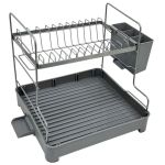 Πιατοθήκη διώροφη μεταλλική σε ασημί ματ χρώμα, με πλαστικό δίσκο και αποσπώμενη κουταλοθήκη σε γκρι χρώμα. Διαθέτει στόμιο αποστράγγισης για την αποφυγή συσσώρευσης νερού στον δίσκο. Εύκολη στον καθαρισμό και στη συντήρηση.