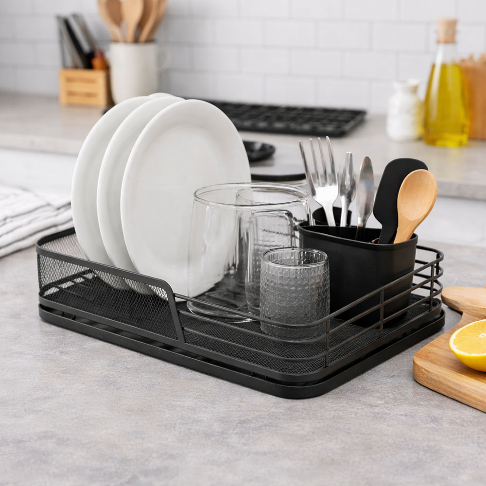 Πιατοθήκη μεταλλική με πλαστικό δίσκο και αποσπώμενη κουταλοθήκη σε μαύρο ματ χρώμα, ιδανική για καθημερινή χρήση στον πάγκο της κουζίνας. Η ανθεκτική μεταλλική κατασκευή προσφέρει σταθερότητα, ενώ ο πλαστικός δίσκος συγκρατεί τα νερά και καθαρίζεται εύκολα. Διαθέτει ευρύχωρους χώρους για αποθήκευση πιάτων, ποτηριών και σκευών, καθώς και πρακτική κουταλοθήκη με 3 διαχωριστικά για καλύτερη οργάνωση μαχαιροπίρουνων και αξεσουάρ.