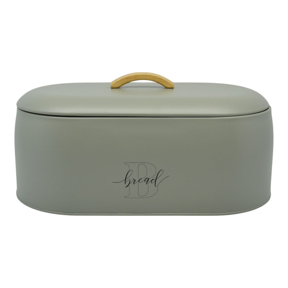 Μεταλλική ψωμιέρα σε λαδί ματ χρώμα με ξύλινη χειρολαβή και διακριτική επιγραφή Bread. Ιδανική για την αποθήκευση ψωμιού και αρτοσκευασμάτων, τα διατηρεί φρέσκα, προστατεύοντάς τα από την υγρασία.