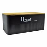 Μεταλλική ψωμιέρα σε μαύρο ματ χρώμα, με διακριτική διακόσμηση ανάγλυφες γραμμές, άσπρη επιγραφή Bread και καπάκι από ξύλο μπαμπού. Ιδανική για τη σωστή διατήρηση του ψωμιού, συνδυάζει πρακτικότητα και στυλ.