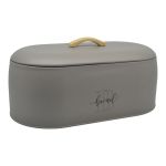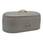 Μεταλλική ψωμιέρα σε taupe ματ χρώμα με ξύλινη χειρολαβή και διακριτική επιγραφή Bread. Ιδανική για την αποθήκευση ψωμιού και αρτοσκευασμάτων, τα διατηρεί φρέσκα, προστατεύοντάς τα από την υγρασία.