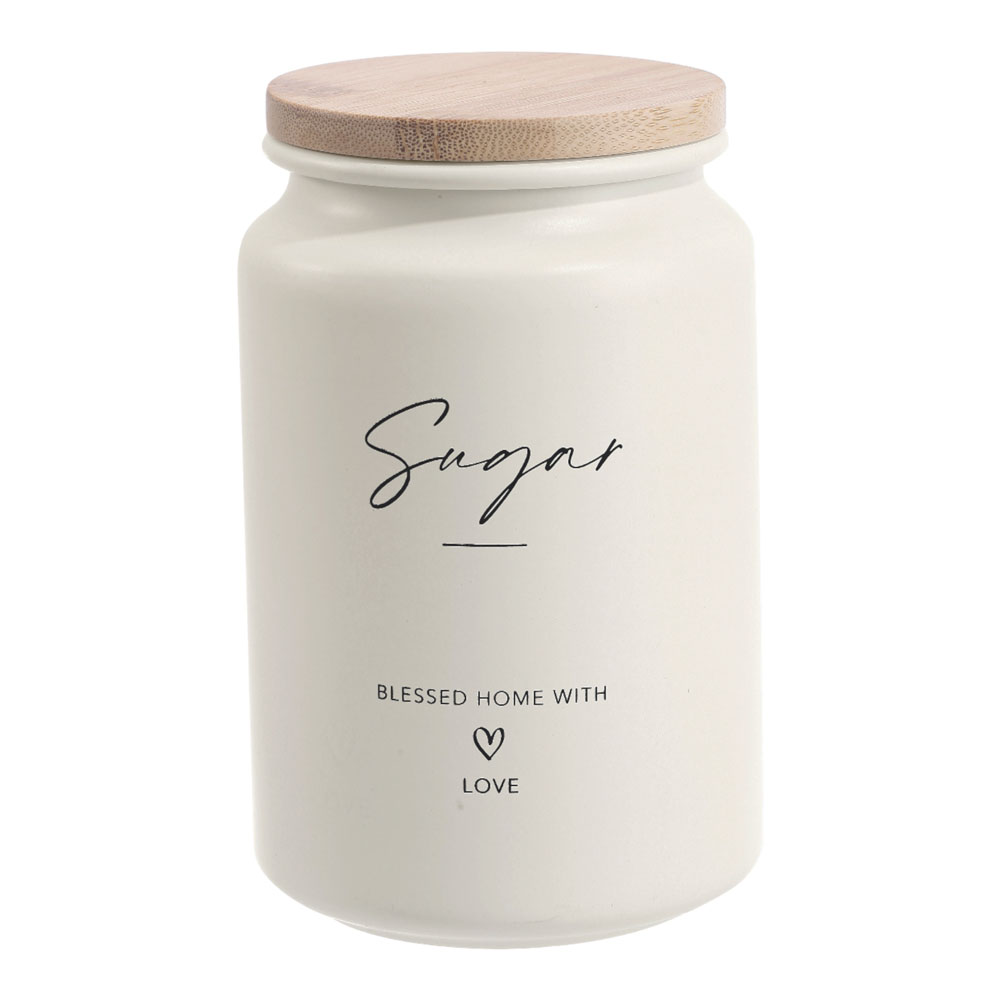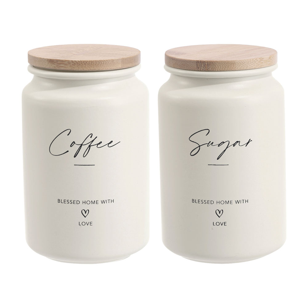 Σετ 2 μεταλλικά βάζα Coffee & Sugar σε μπεζ ματ χρώμα με διακριτική επιγραφή. Διαθέτουν μπαμπού καπάκι και εσωτερική σιλικόνη για αεροστεγές κλείσιμο, προστατεύοντας το περιεχόμενο από την υγρασία.