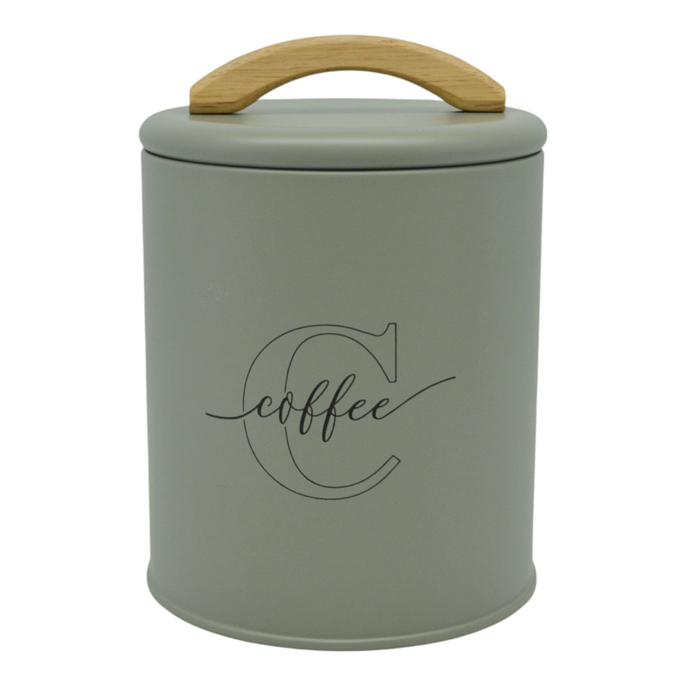 Βάζο μεταλλικό σε λαδί ματ χρώμα με ξύλινη χειρολαβή και διακριτική επιγραφή Coffee. Συνδυάστε το με τα υπόλοιπα αντικείμενα της σειράς και ανανεώστε τον χώρο σας.